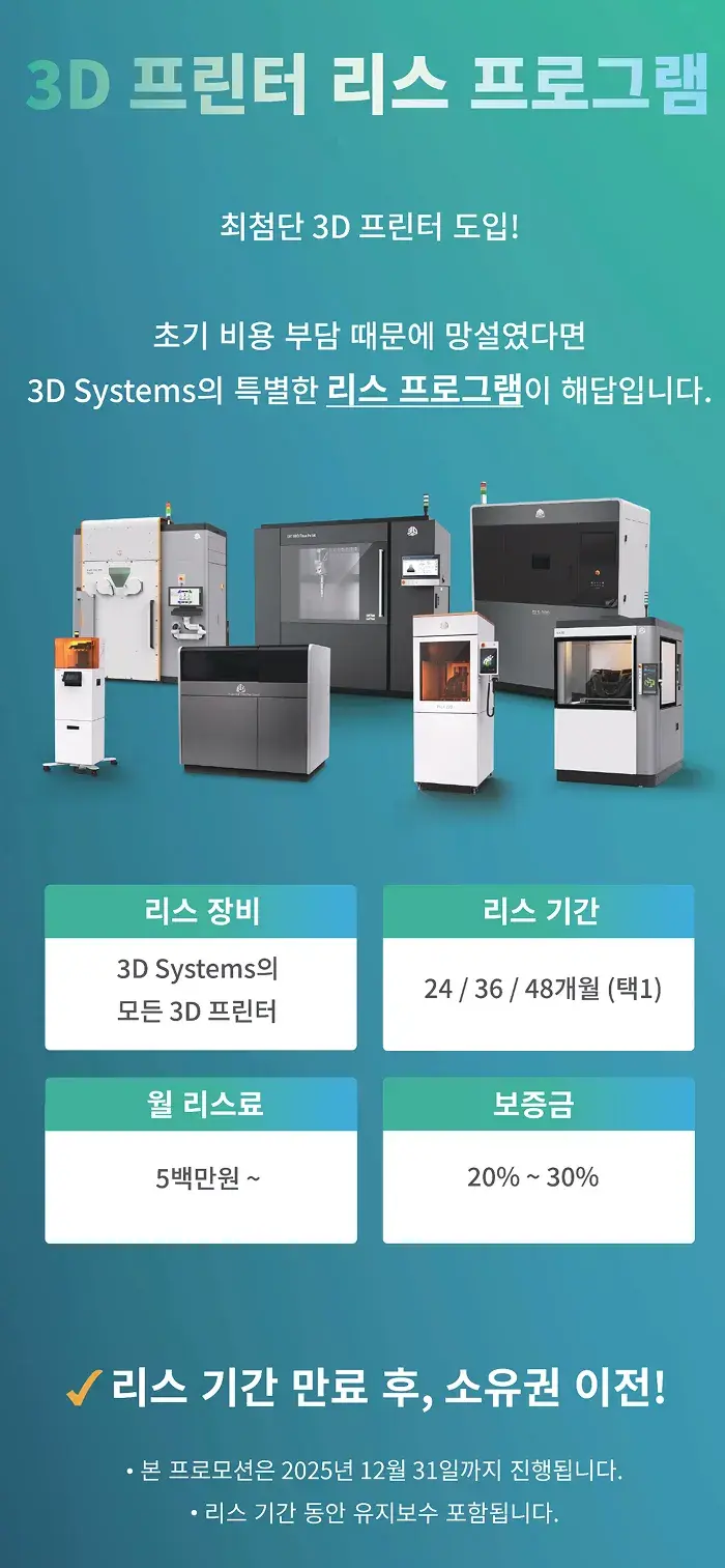 안녕하세요. 3D Systems입니다.본 리스 프로모션은 고객 여러분의 초기 비용 부담과 유지보수 관련 우려를 해소하고자 기획된 특별 프로모션입니다.장비 구성 및 리스 기간에 따라 월 리스료와 보증금이 상이하며, 리스 기간 만료 시 소유권 이전이 가능합니다.보다 상세한 상담을 원하시면 상담 신청을 남겨주십시오. 담당자가 신속히 연락드리겠습니다.T. 02-6262-9900E. korea.printer.sales@3dsystems.com