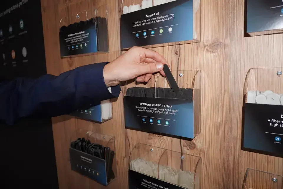 부스 내 마련된 '머티리얼 월(Material Wall)'에서는 항공우주 및 운송 분야를 비롯해 다양한 산업 현장에서 실제 활용 중인 광범위한 소재 포트폴리오를 한눈에 확인할 수 있었습니다. 특히 참관객들은 이번에 공개된 신소재 2종인 Accura® SbF(최신 SLA 주조용 레진)와 Accura Xtreme Black(고성능 프로토타이핑 레진)의 샘플을 직접 체험하며 소재의 우수성을 확인했습니다.